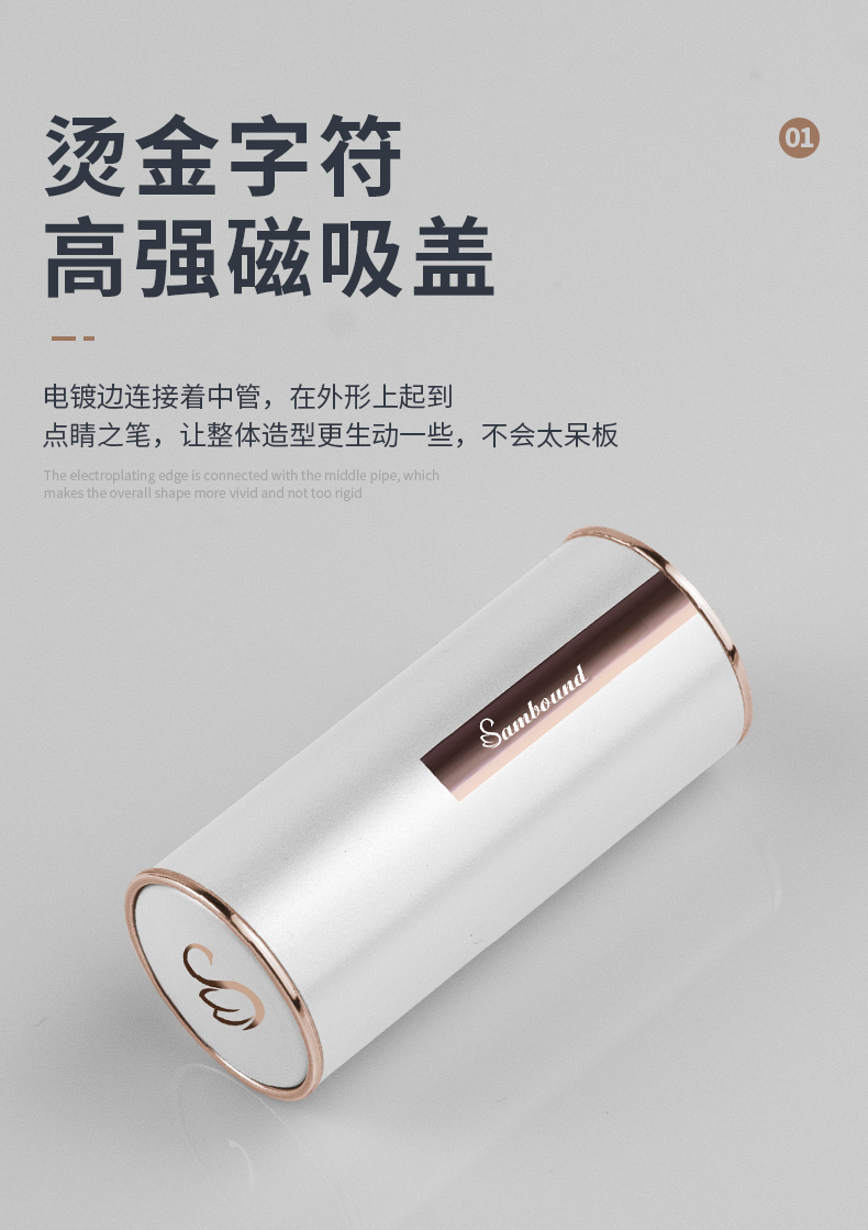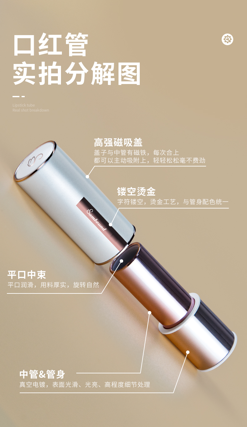 全鋁材質(zhì)口紅管,表面噴砂珠光白,磁吸款加墜重,增加厚重手感,口紅管包材廠家,可接受來圖來樣定制