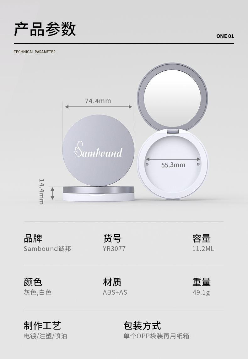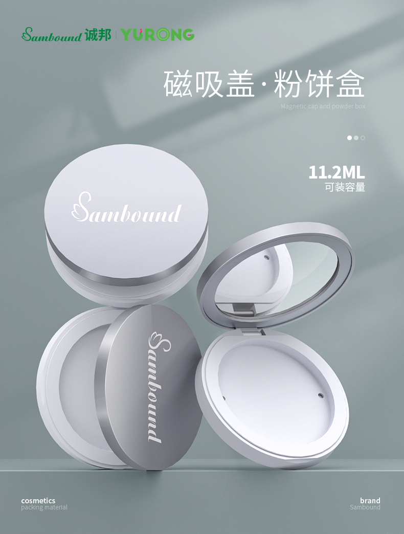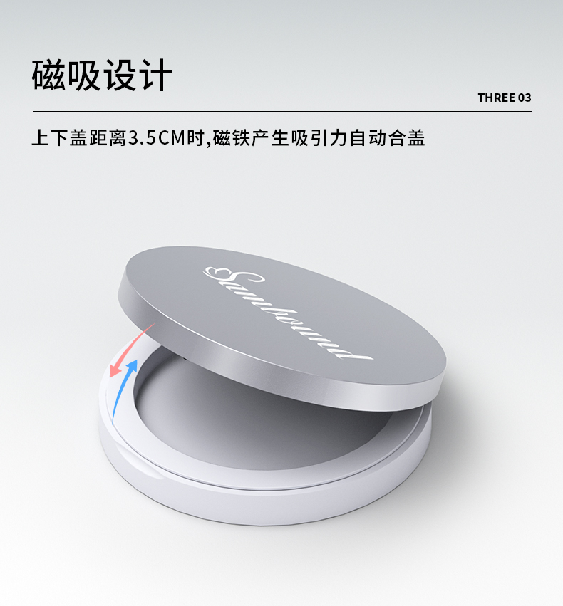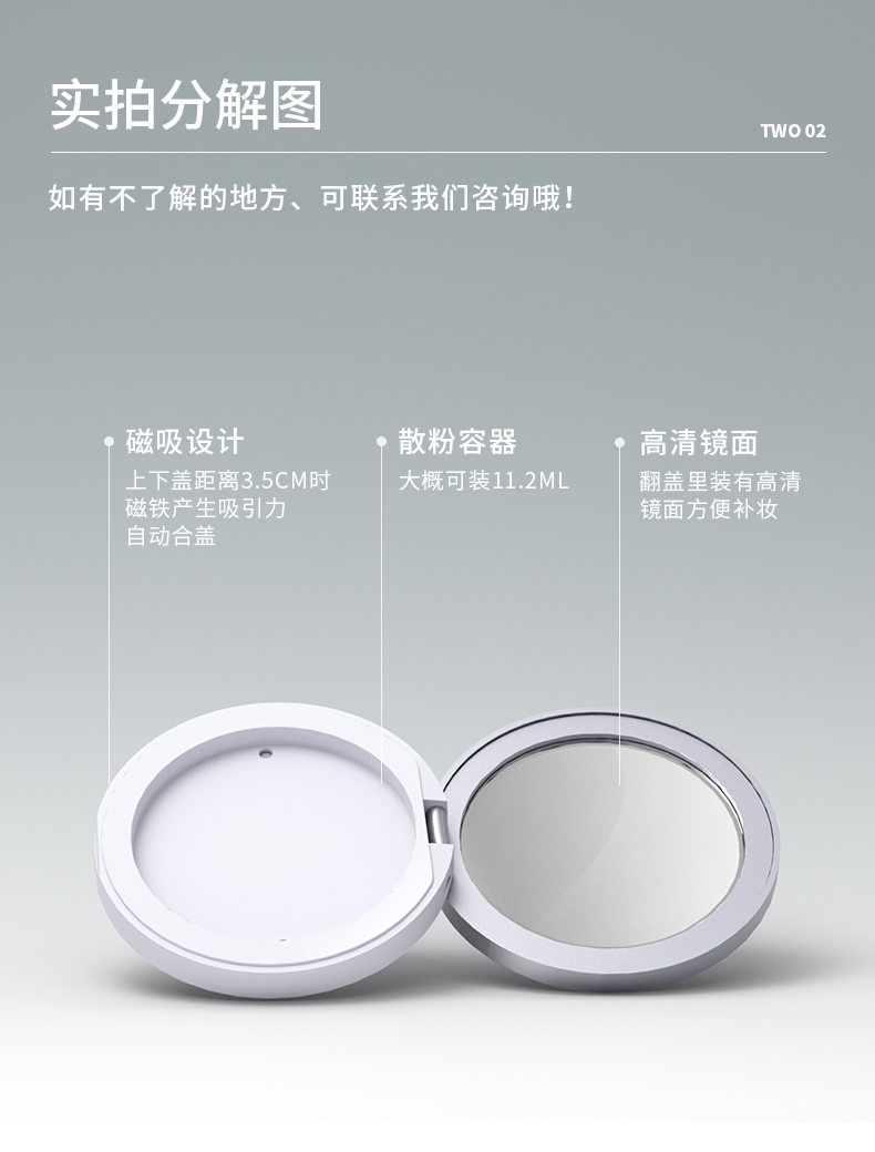 圓形磁吸空粉餅盒定妝遮瑕化妝品包裝定制廠家,采用磁吸開關,表面電鍍啞光銀色,手感舒適,外形大氣,我們也可以根據您的需求定做表面工藝和顏色。