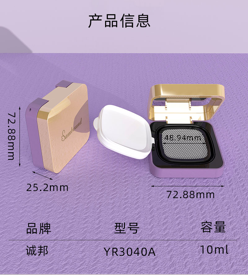 產品名稱氣墊包材產品貨號YR3040容量17ML顏色金色-可定制材質ABS重量32 9g制做工藝注塑 噴油 真空電鍍包裝方式單個OPP袋裝再用紙箱
