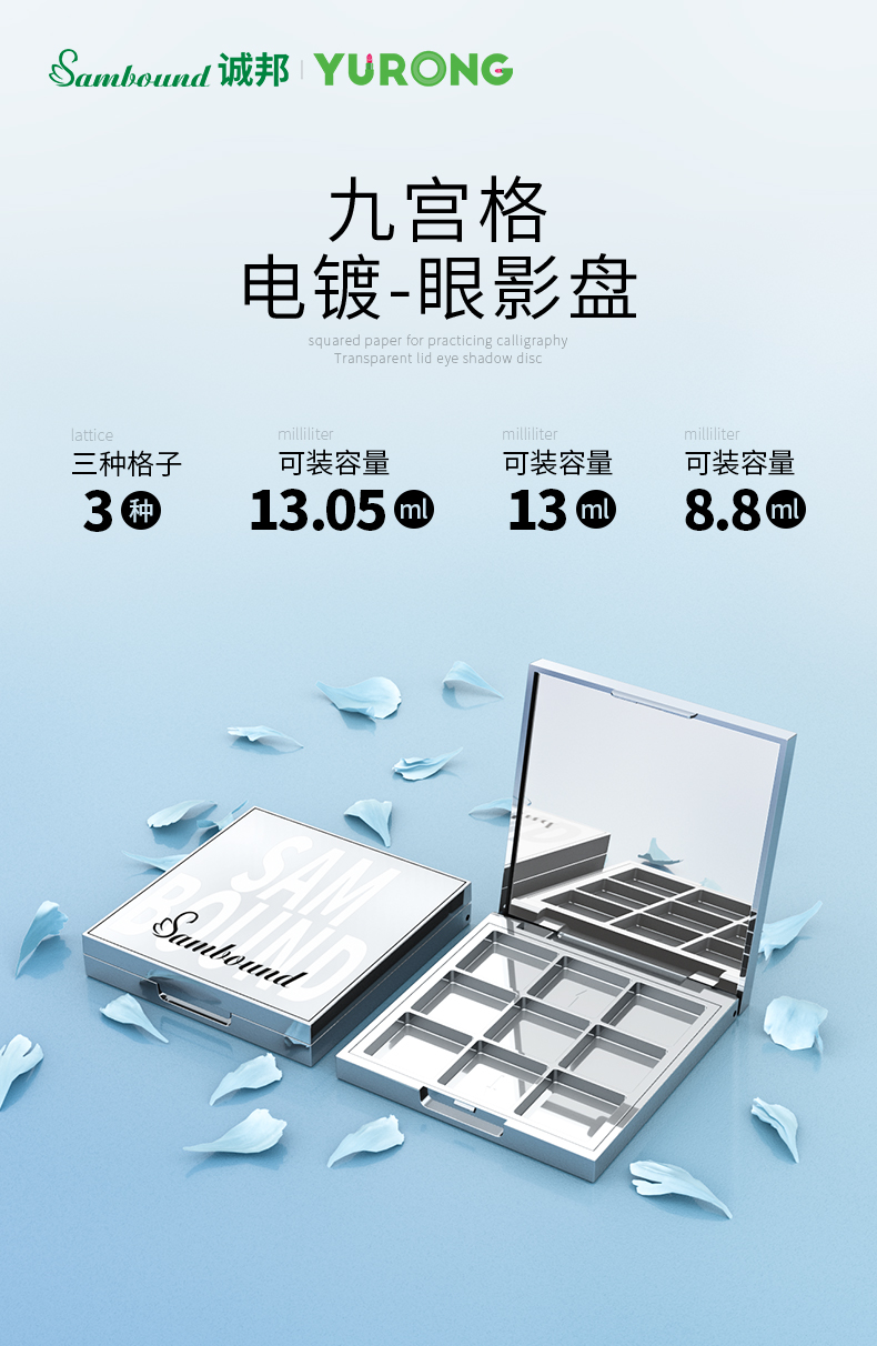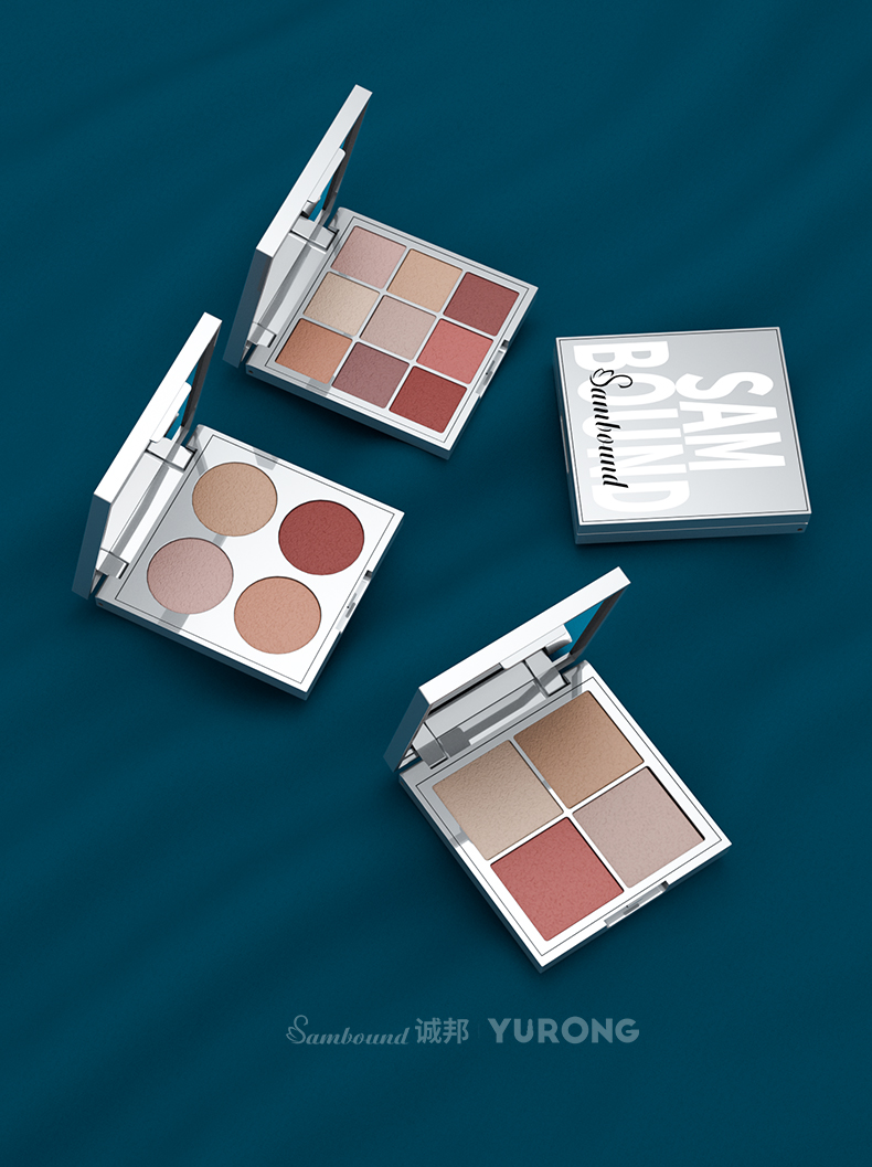 東莞誠邦化妝品包材廠家定制的這款9宮格眼影盤采用銀色電鍍工藝,奢華有質感,并且使用按扣開關設計,方便操作。可以定制文字logo