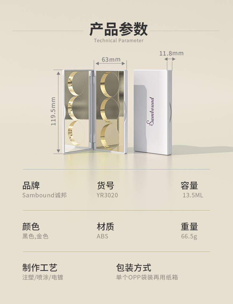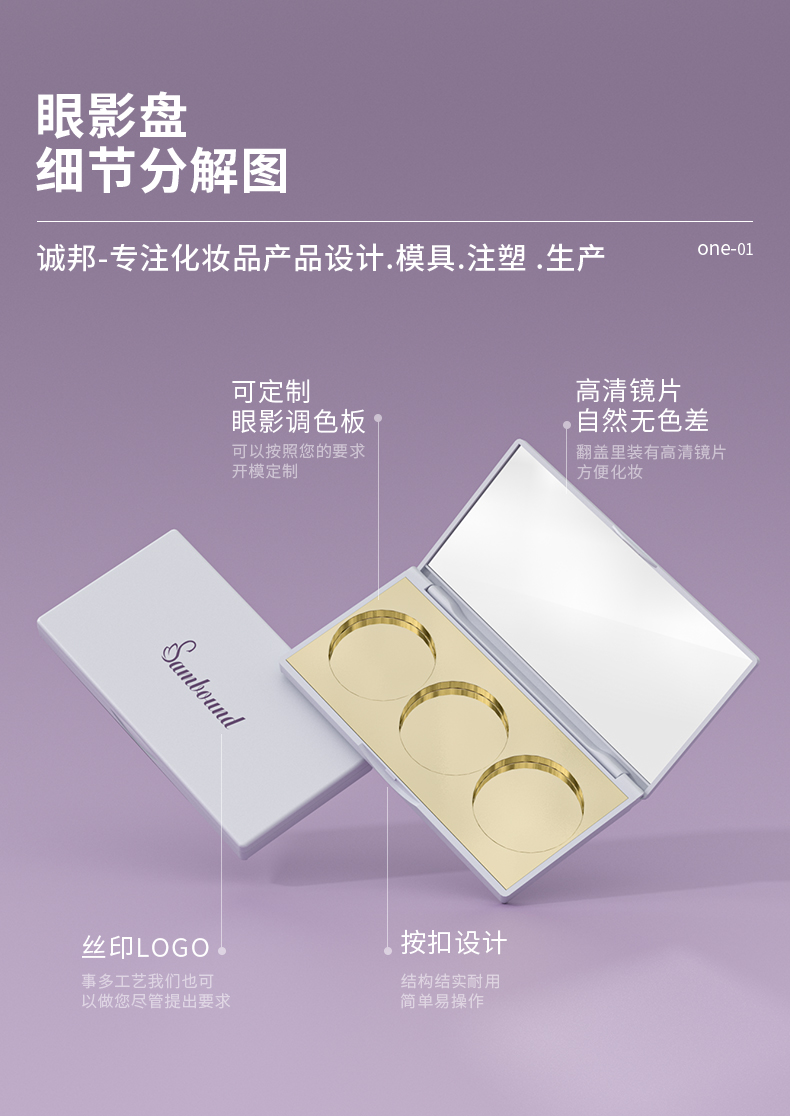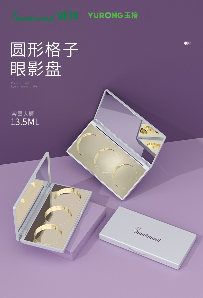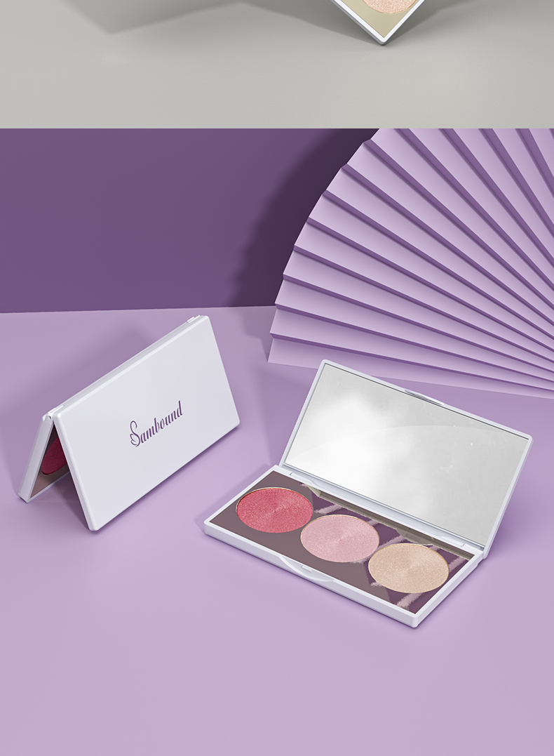 眼影盤包材特點:高光修容鼻影3色圓形眼影一體盤,采用電鍍色,也可定制顏色和logo,免費提供樣品