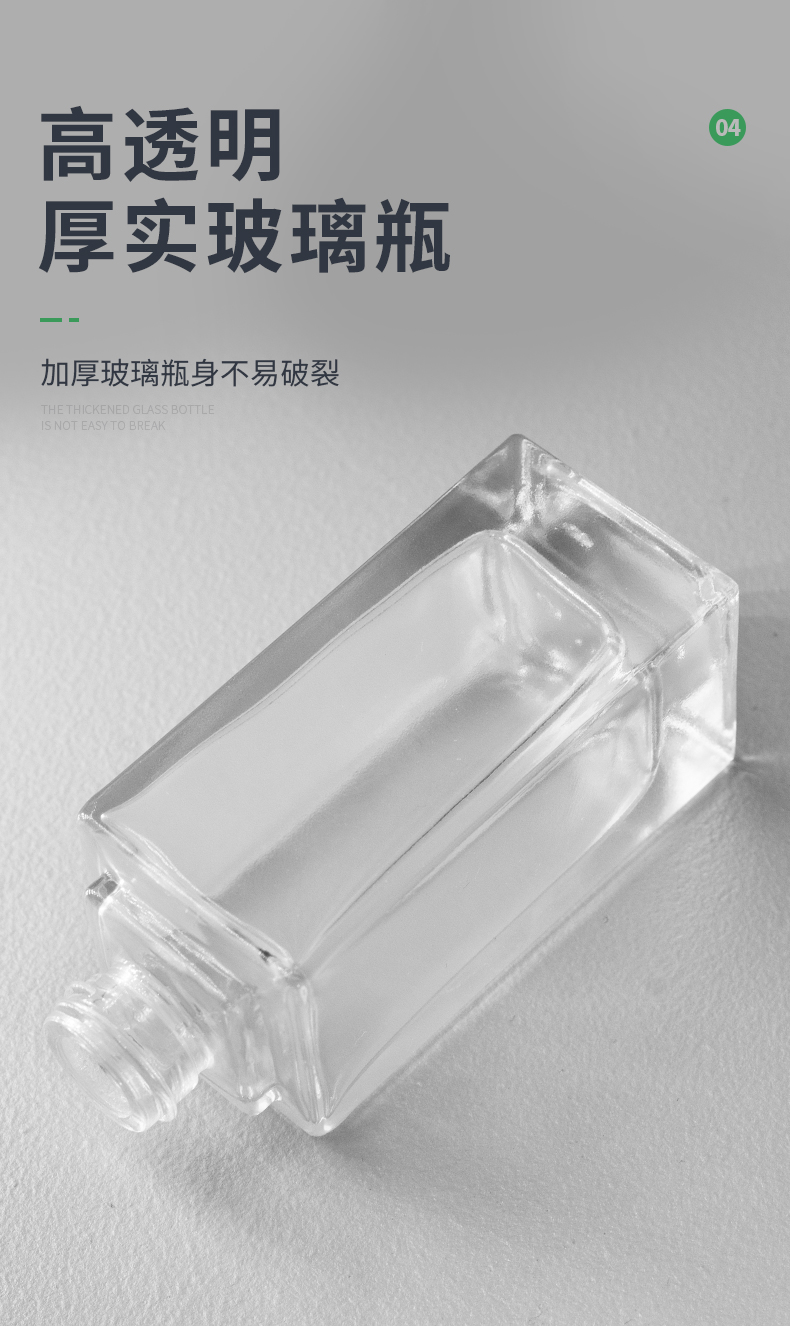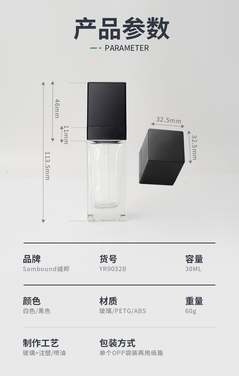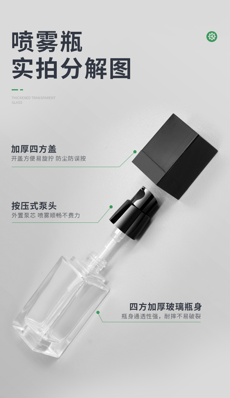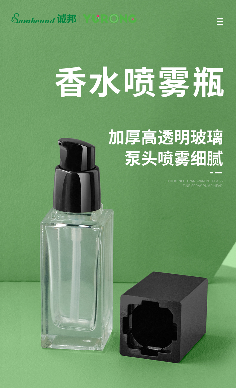 這款香水噴霧玻璃瓶采用ABS加厚蓋,按壓式泵頭設計,30ml容量,加厚玻璃瓶身,廠家可以定制工藝