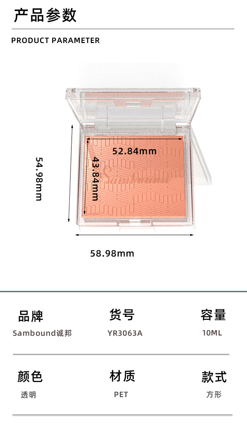 產(chǎn)品名稱修容盒包材產(chǎn)品貨號(hào)YR3163a容量10ML顏色透明-可定制材質(zhì)PET重量32 9g制做工藝注塑包裝方式單個(gè)OPP袋裝再用紙箱