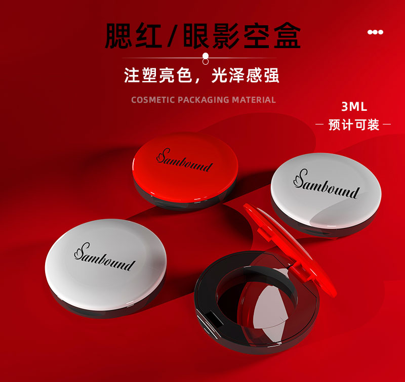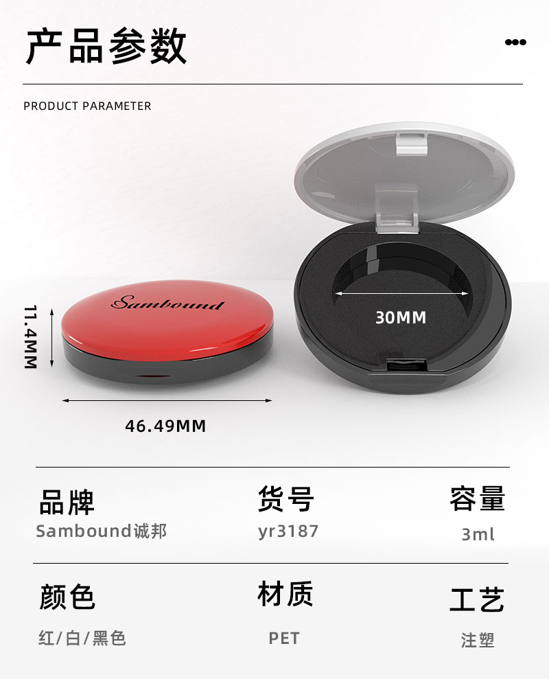產品名稱粉盒包材產品貨號YR3187容量3ML顏色黑白色-可定制材質ABS重量32 9g制做工藝注塑包裝方式單個OPP袋裝再用紙箱